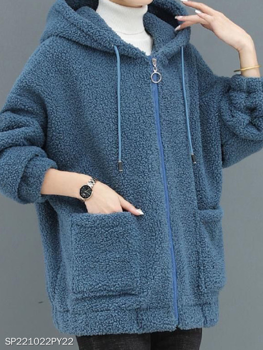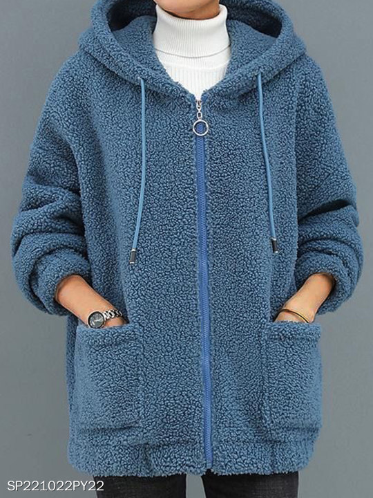 Autumn Winter Warm Plush Solid Color Zip Pocket Hooded Loose Jacket Coat