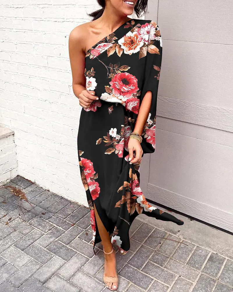 Sexy Slanted Shoulder Floral Print One Sleeve Dress