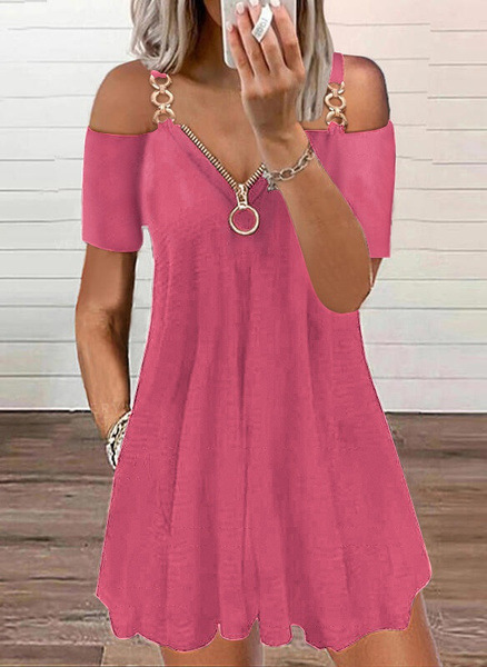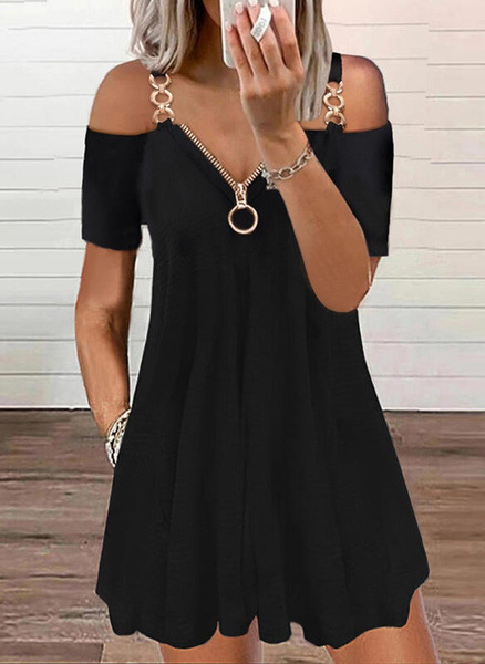 Casual Round Neck Zipper Off Shoulder Short Sleeve Dress