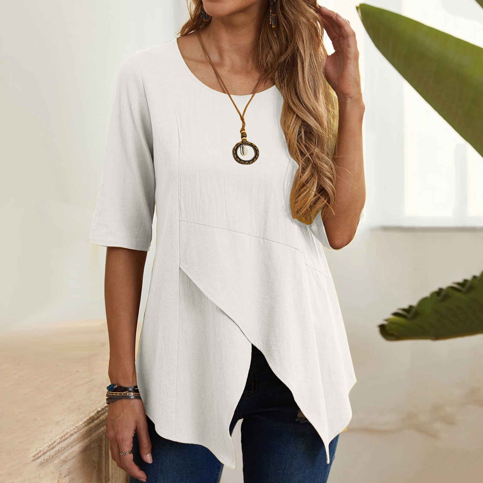 Irregular Round Neck Mid-length Sleeve cotton linen T-shirt top
