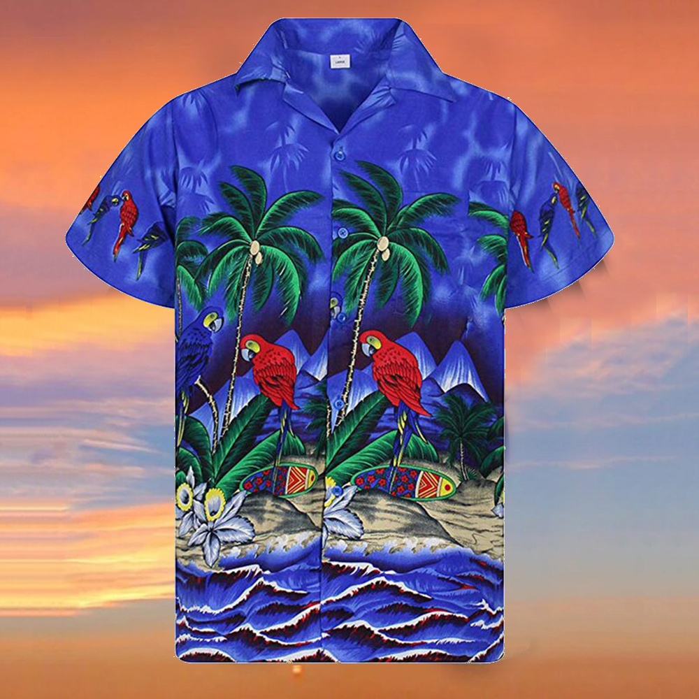 Men's Hawaiian Parrot Coconut Tree Print Short Sleeve Lapel Shirt
