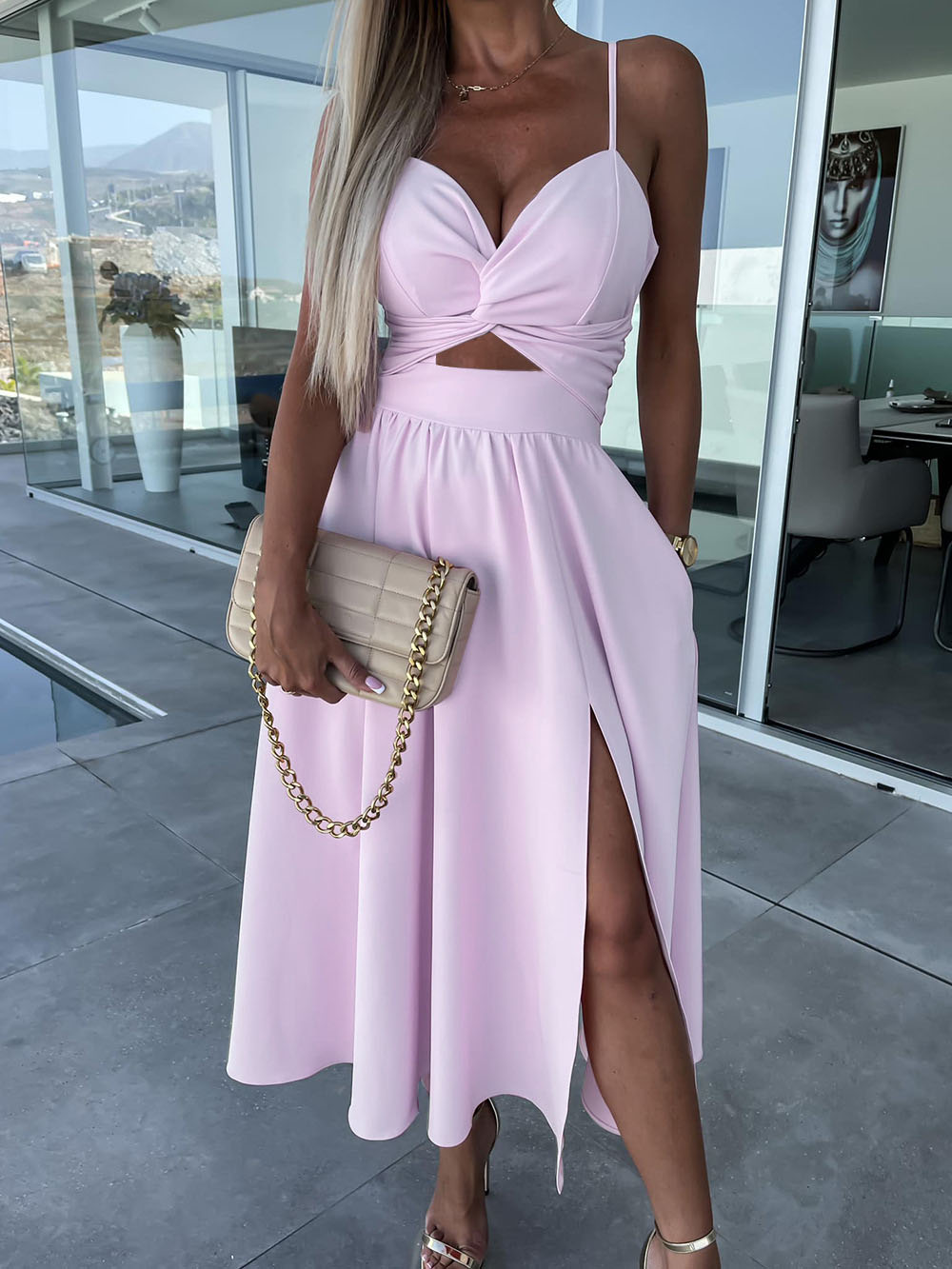 Sling V-neck Swing Dress Slim Backless Mid-Length Dress