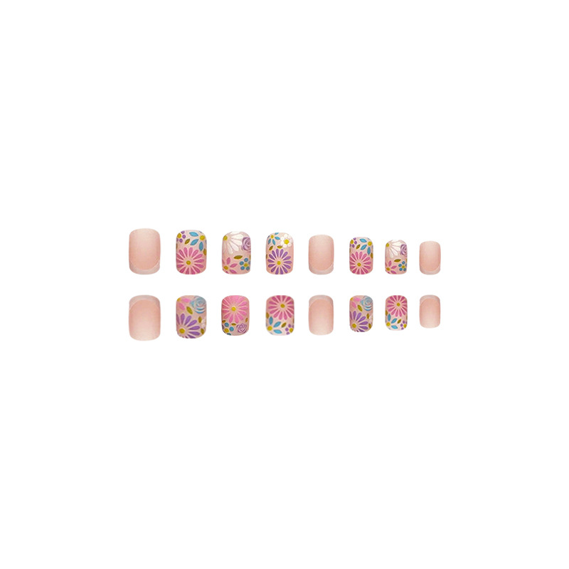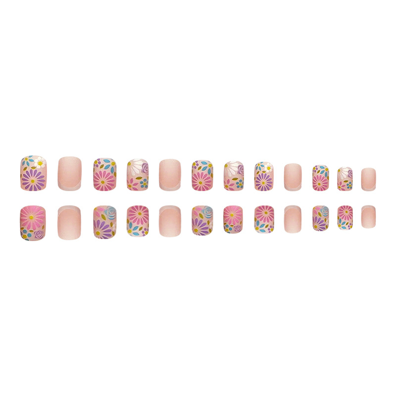 Square Short Fake Nail French Colorful Flowers Press on Nails for Nail Art 24pcs Summer Nails