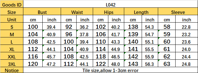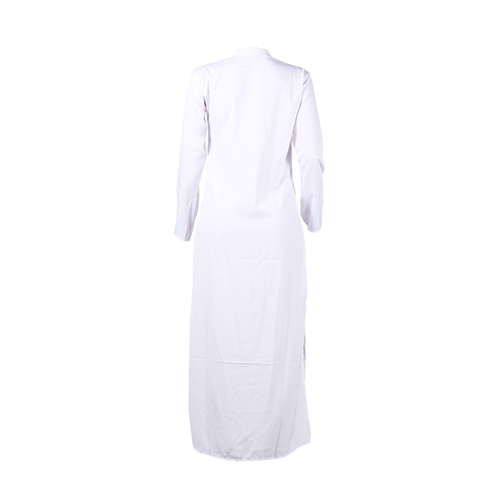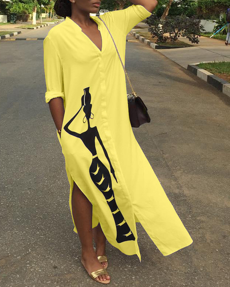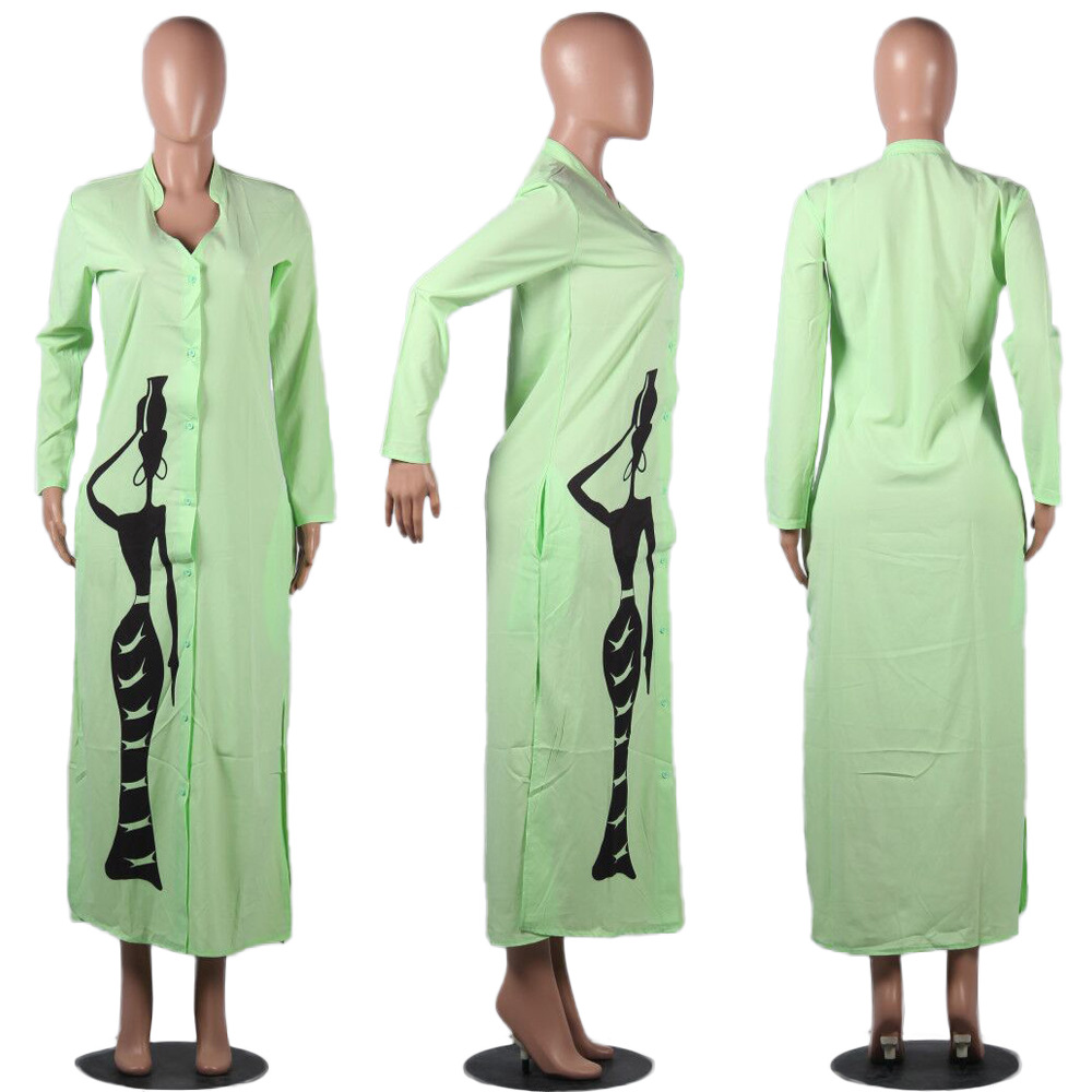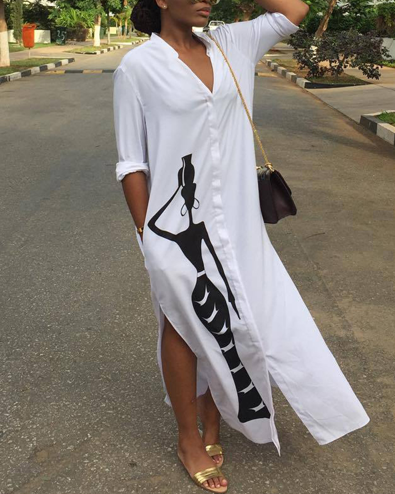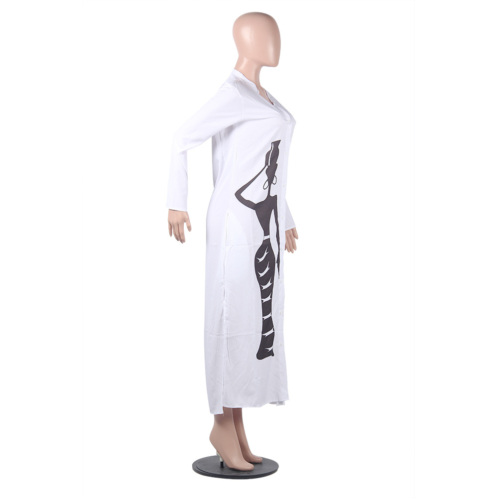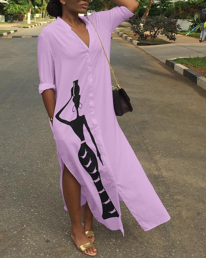 Women's Long Sleeve Printed V-Neck Slit Long Shirt Dress